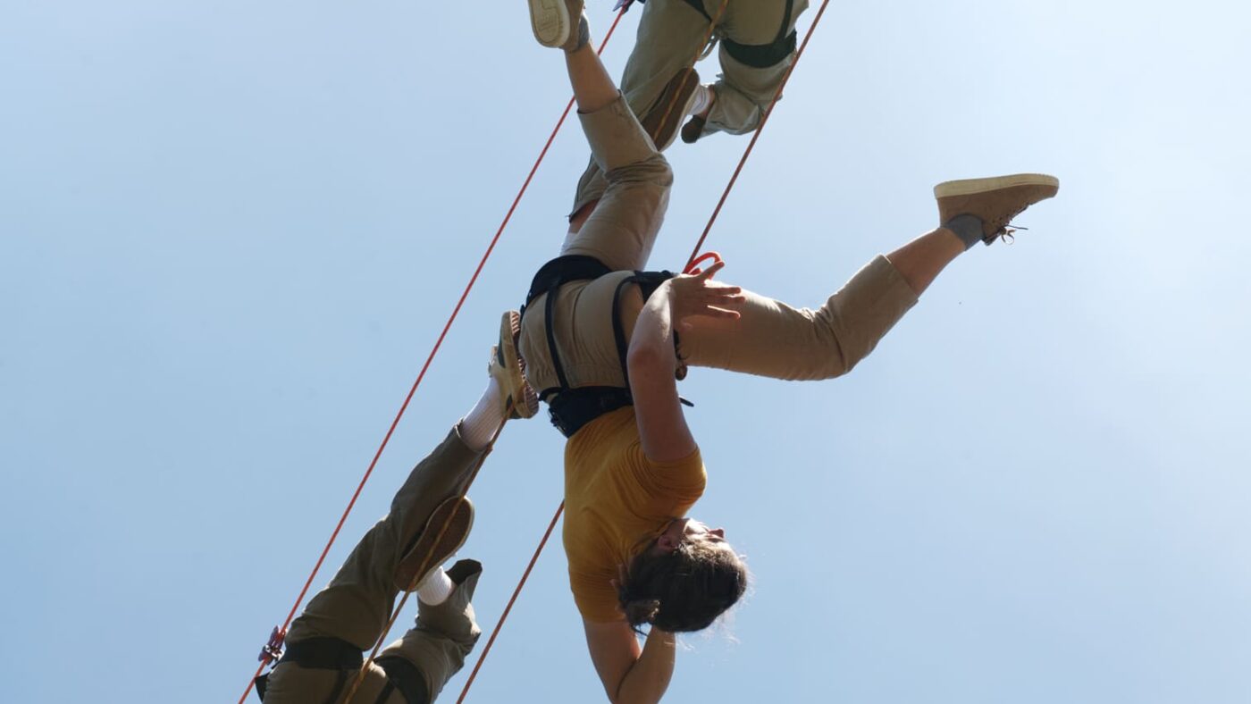 ANCRAGE est un spectacle chorégraphique hybride entre danse contemporaine, aérienne et captations de sons de la nature, spécifiquement conçu pour des milieux naturels et trois danseurs.